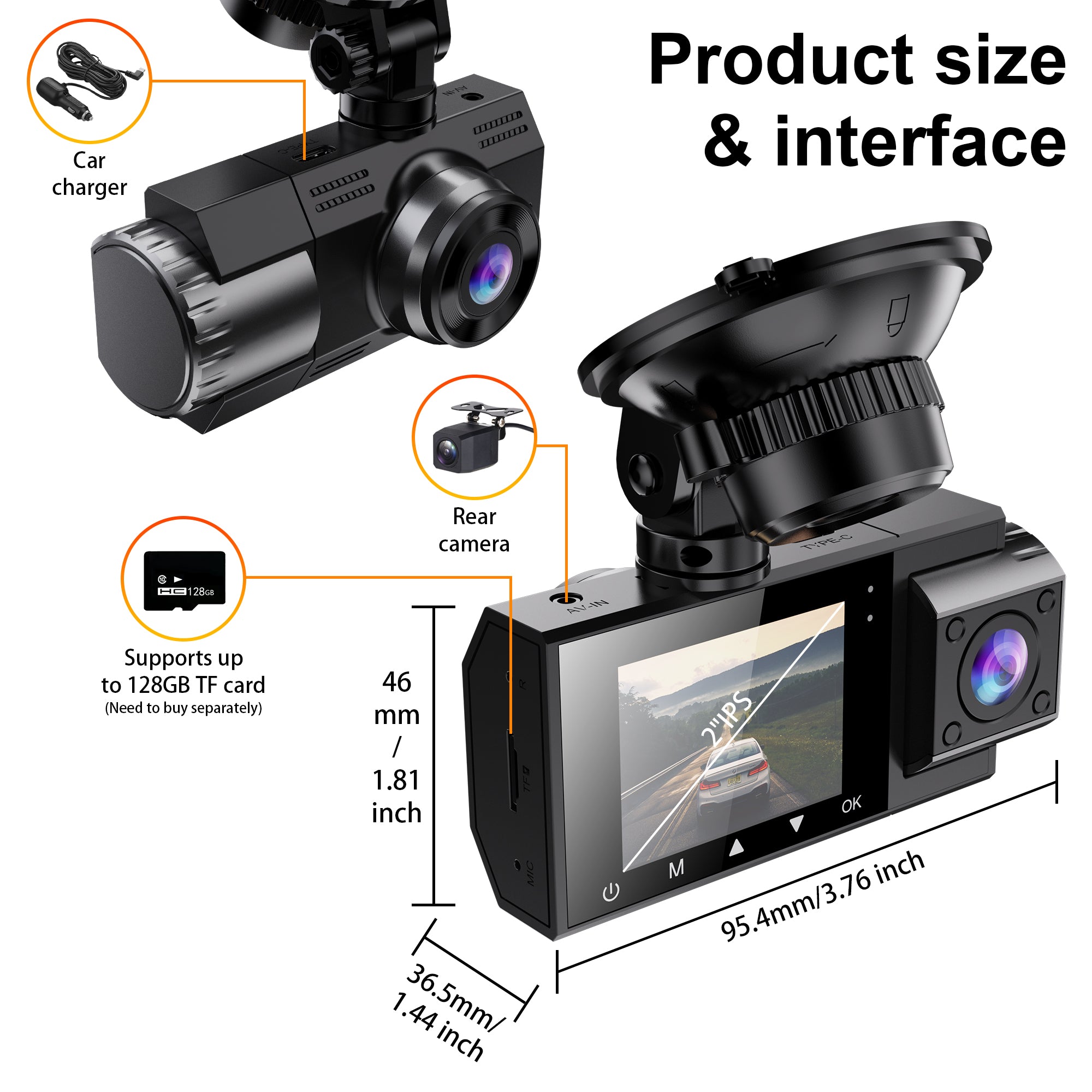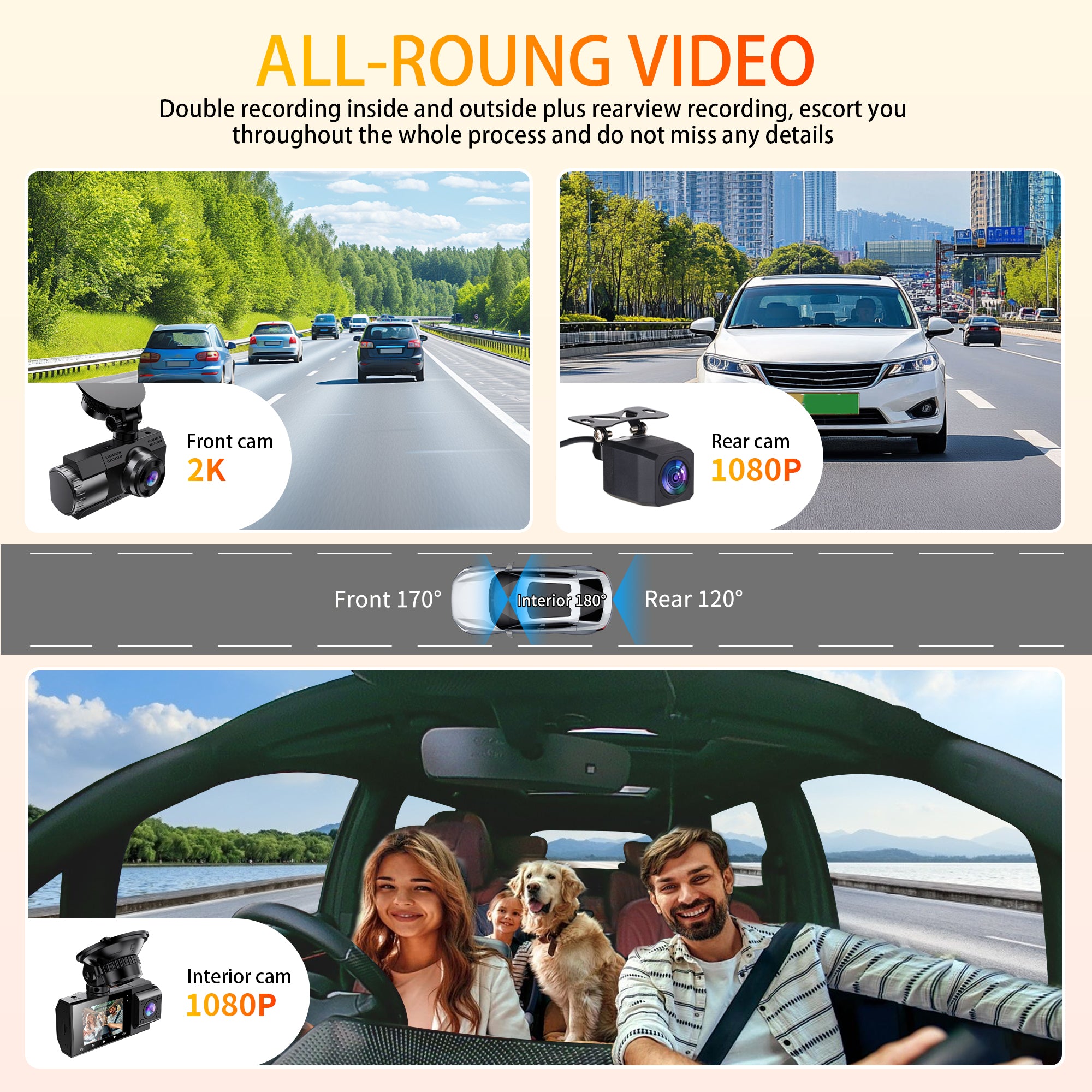 1. Triple Lens Recording: 2K Front + 1080P Rear + 1080P Cabin