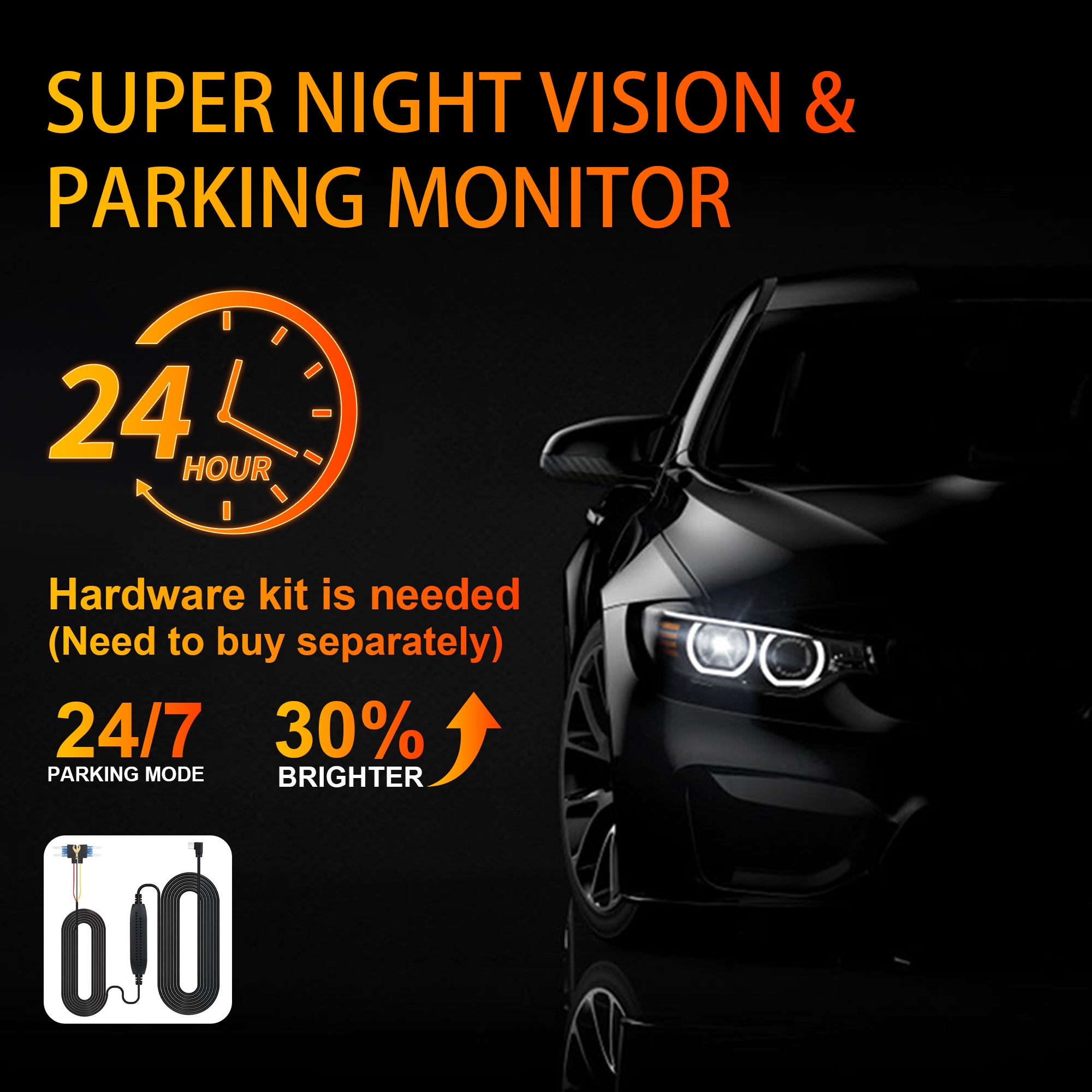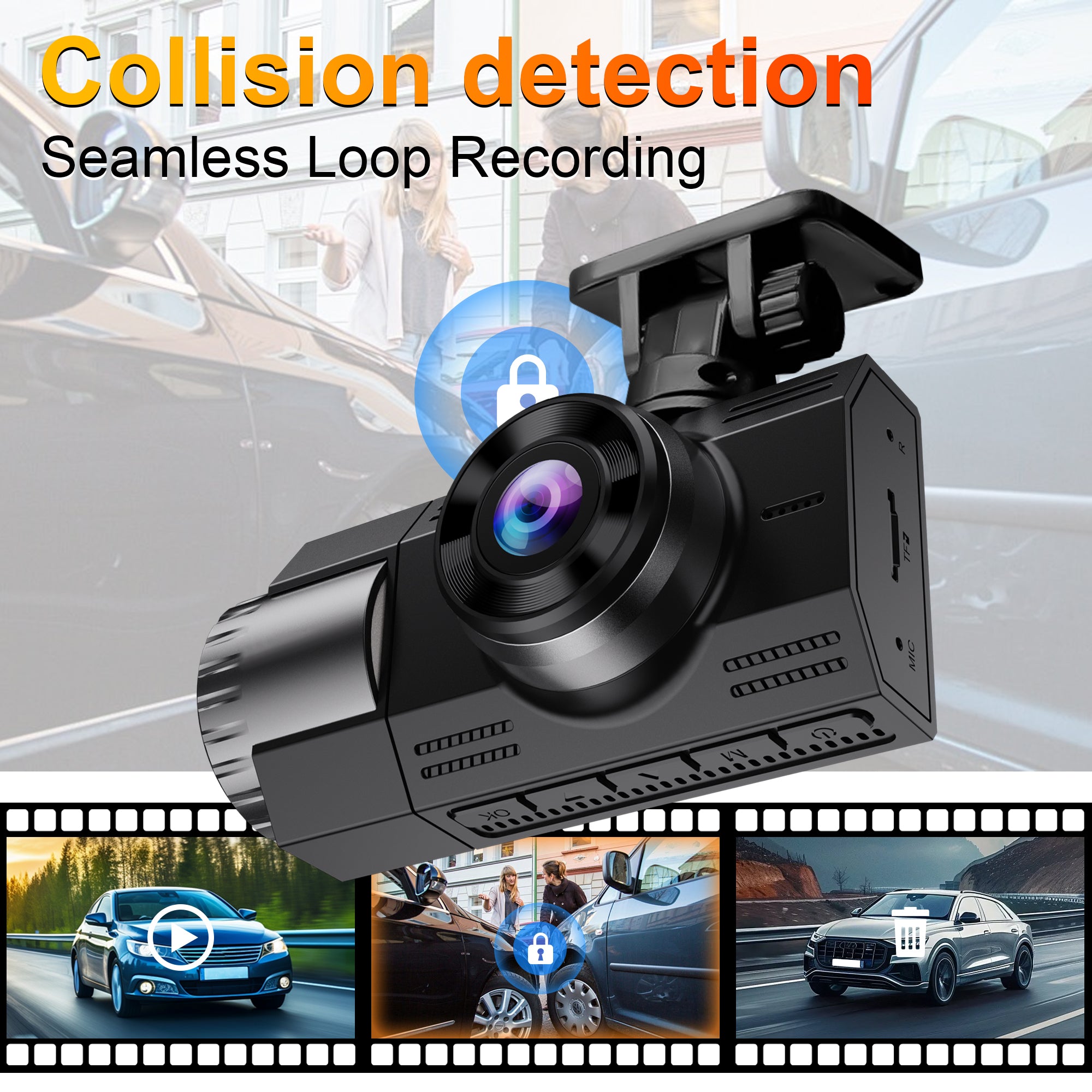 Protect your vehicle even when parked. The dashcam detects vibrations, motion, or bumps and starts recording automatically (parking mode requires hardwire kit).