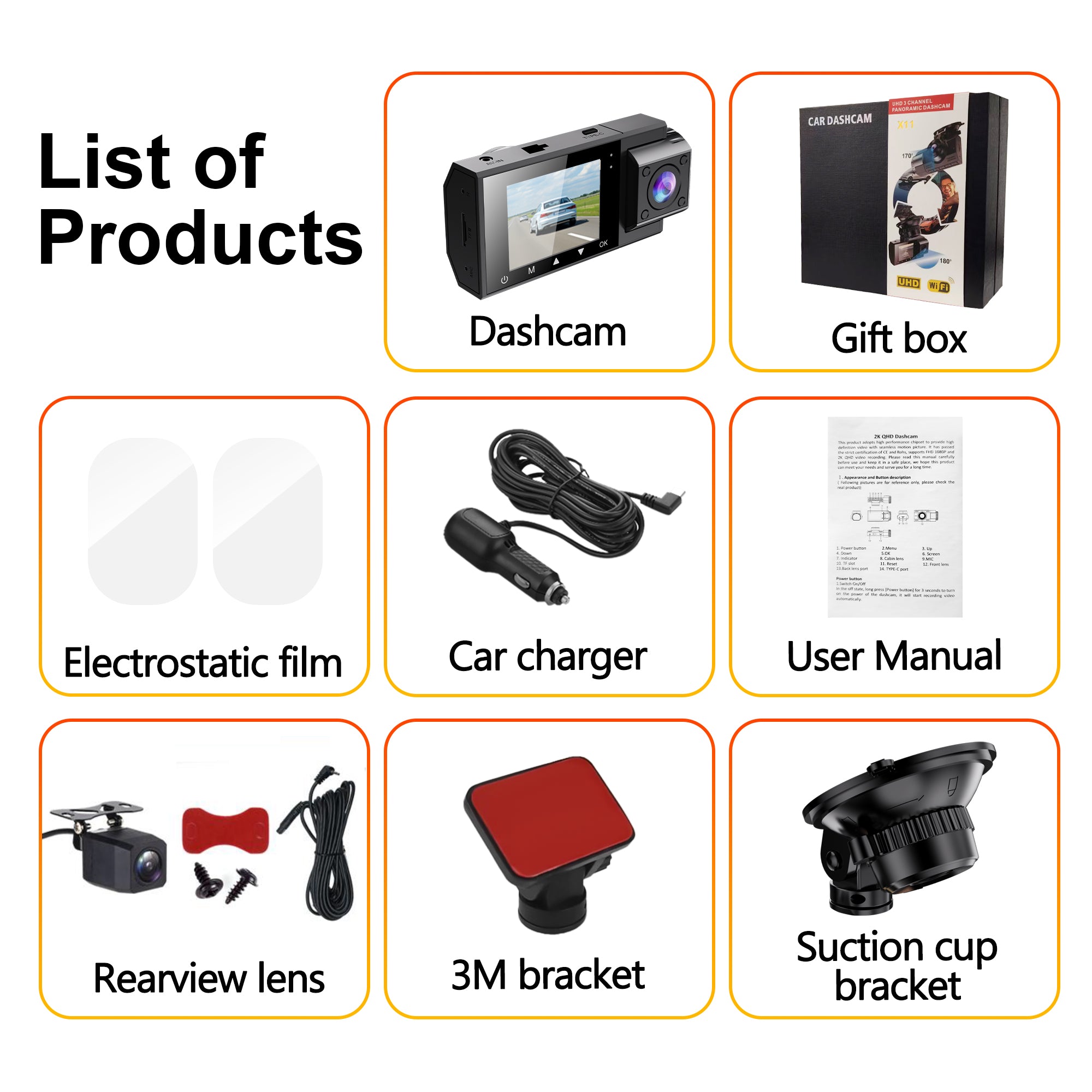 Comes with electrostatic film, 1080P rear lens, suction cup mount, 3M bracket, car charger, and user manual for quick and hassle-free setup in any vehicle.